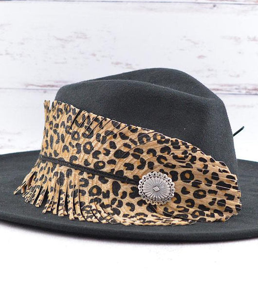 Beautiful Cow or Leopard Printed Faux Leather Hat Band. Feather Design with a Burnished Silver Concho and ties to adjust the band to fit any size hat. Hat in Picture not Included