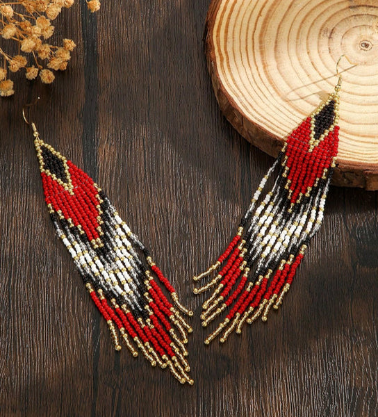 Boho-Chic Black & Red Beaded Long Tassel Earrings