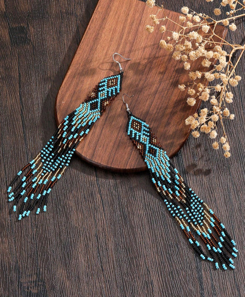 Boho-Chic Blue & Brown Aztec Beaded Long Tassel Earrings