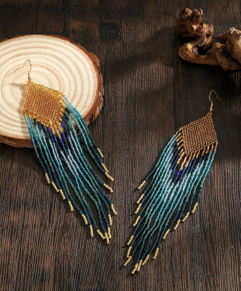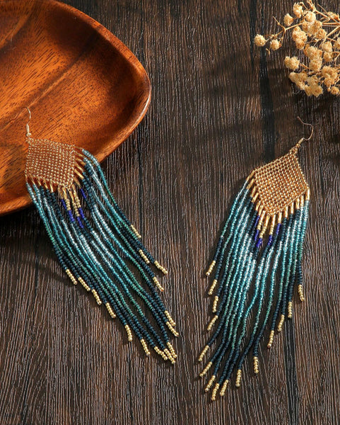 Boho-Chic Blues & Gold Beaded Long Tassel Earrings