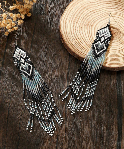Boho-Chic Black & White Beaded Long Tassel Earrings