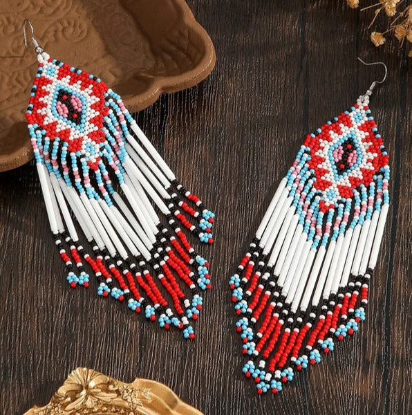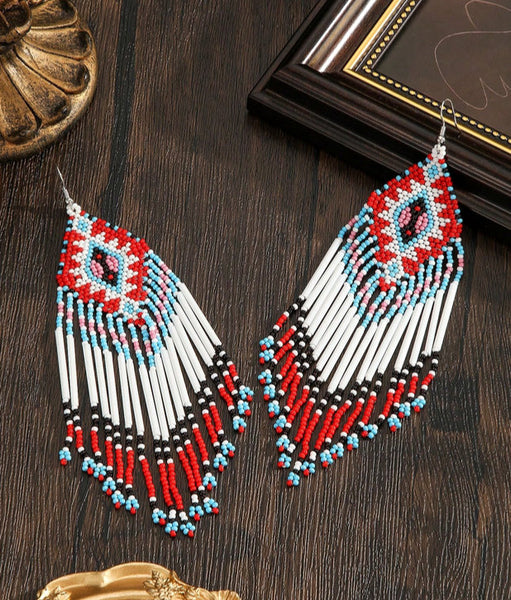 Boho-Chic Red & White Beaded Long Tassel Earrings