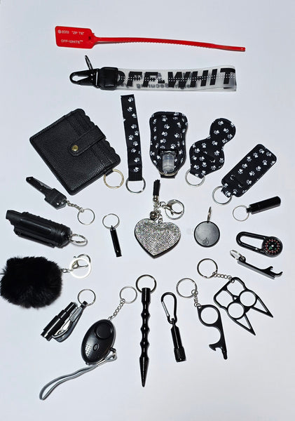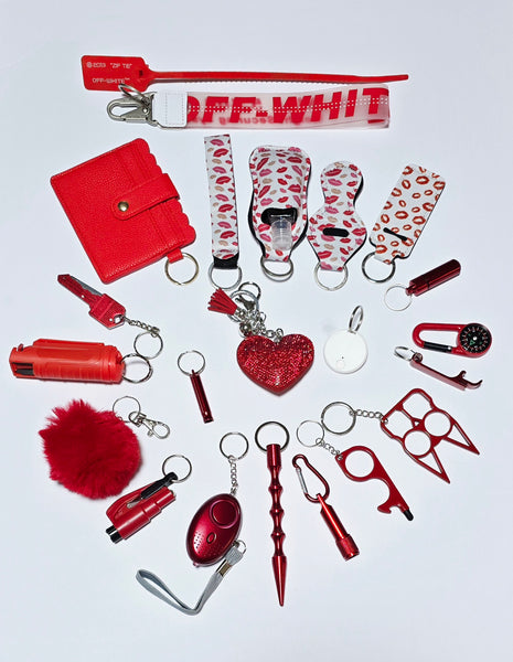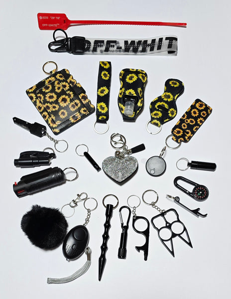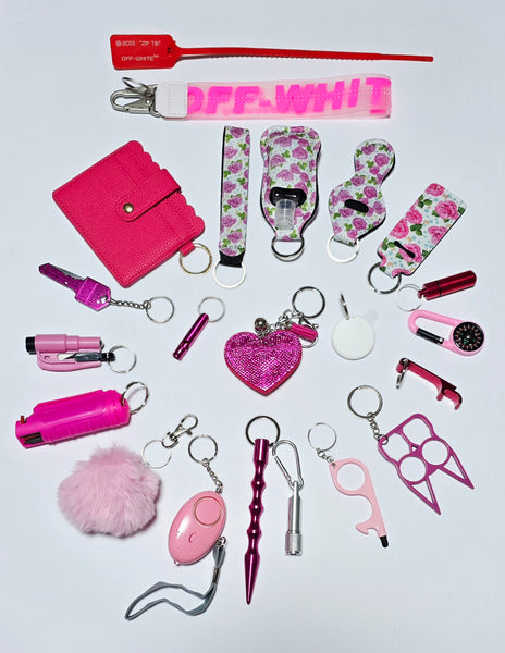 For added reassurance, this Key Chain Set comes with: A Soft Neoprene Wristlet, Hand Sanitizer Pouch with Empty Bottle, Lotion Pouch, Lipstick Pouch, Personal Safety Alarm with LED Light, Seat Belt Cutter/Windshield Breaker, Handy No-Touch Tool/Stylus, Security Whistle, Bottle/Can Opener, Pepper Spray, Blue-Tooth Key Finder, Kitty Knuckles, Discreet Key Knife, Pointed Kubaton (Window Breaker), Mini Flashlight, Wallet/Credit Card Holder, Waterproof Pill Bottle, Compass, Bling Heart Key Chain & Pom Pom Key Chain. Also Includes an Off White Key Chain.  It will also come with 2 Free Gifts: A Lip Gloss & Lotion to fill your 2 extra pouches. There are SO Many Items in this Set that you can make multiple Key Chain Sets.