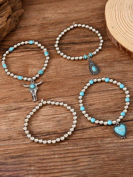 Turquoise & Silver Western Bracelets with Heart, Steer, & Teardrop Charms (4 Pieces)