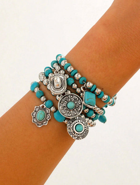 Turquoise & Silver Western Stack Bracelets with Charms (5 Pieces)