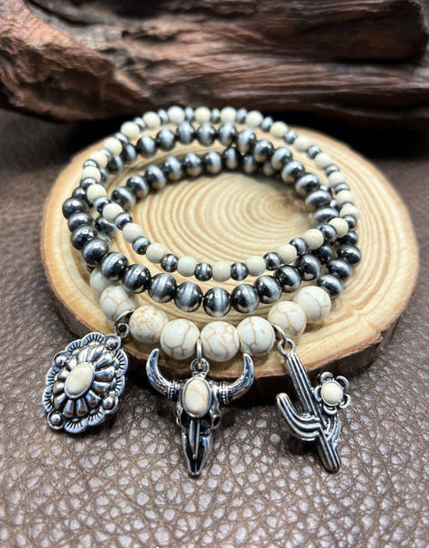 Western 3 Piece Bracelet Set with Steer, Cactus, & Concho Charms (4 Color Choices)